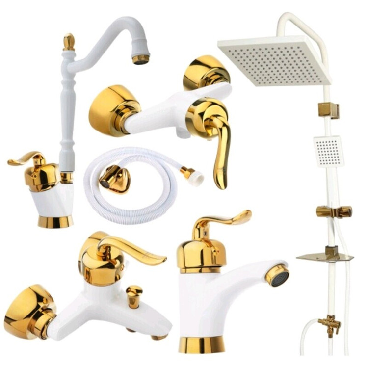 ست شیرآلات سفید طلا مدل قاجاری برند ایران گروه همراه با علم دوش دو کاره و شلنگ توالت