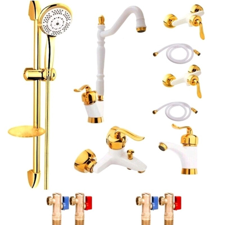 ست ۱۲ عددی شیرآلات سفید طلا مدل قاجاری برند ایران شامل شیر حمام و دوش تک کاره یک عدد شیر ظرفشویی یک عدد شیر روشویی دو عدد شیر آفتابه و دو عدد شلنگ توالت چهار عدد شیر پیسوار دارای نشان استاندارد ملی دارای گارانتی ۷ساله معتبر شرکتی جنس آلیاژ بدنه برنجی وآبکاری درجه یک کارتریج ۴۰ همراه با اتصالات کامل