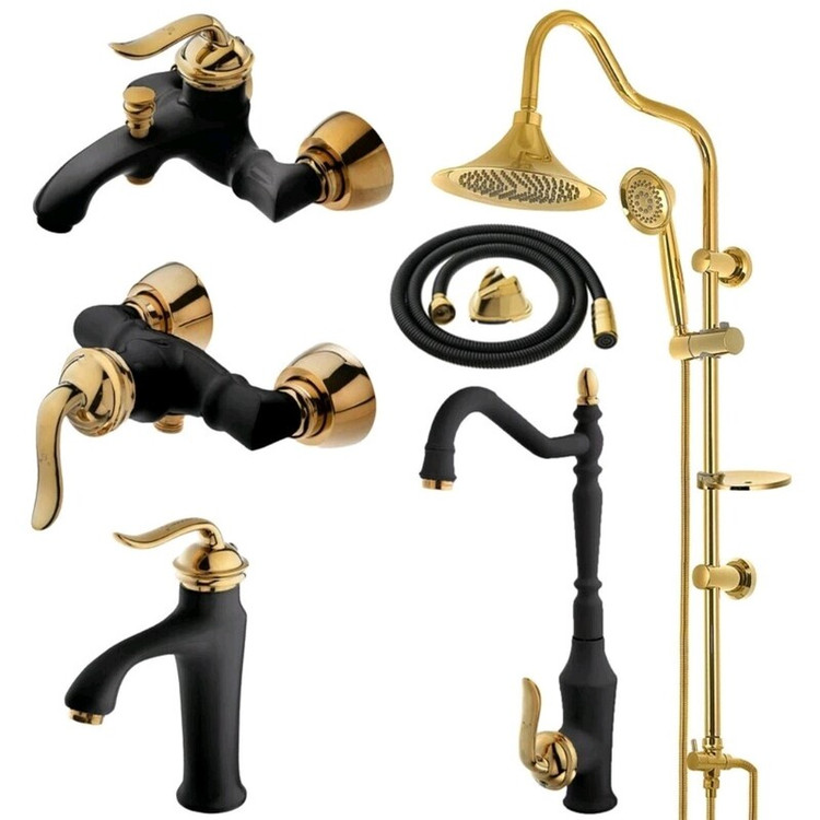 ست کامل ۶ تایی شیرآلات هلن مشکی طلایی با ۷ سال گارانتی معتبر شرکتی و استاندارد ملی ایران آبکاری درجه یک شامل : شیر دوش -شیر روشویی-شیرآفتابه-شیر ظرفشویی - علم دوش دوکاره شیپوری طلایی- شیلنگ توالت ریز بافت