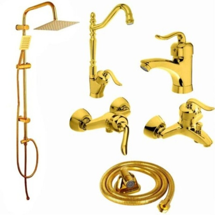 ست کامل شیرآلات اهرمی قاجاری طلایی با دوش دوکاره و شیلنگ توالت